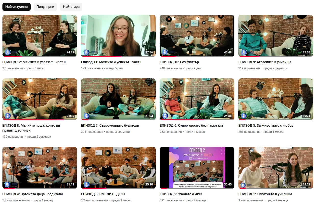 Проектът „Подкастът на децата“ завърши успешно деветмесечната си работа, в рамките на която 30 ученици преминаха през менторска програма по създаване на видеосъдържание. Под ръководството на режисьора Деница Дончева – Денката, децата и младежите преминаха през пълен цикъл на създаване на видеосъдържание и реализираха 12 образователни епизода, насочени към техните връстници.